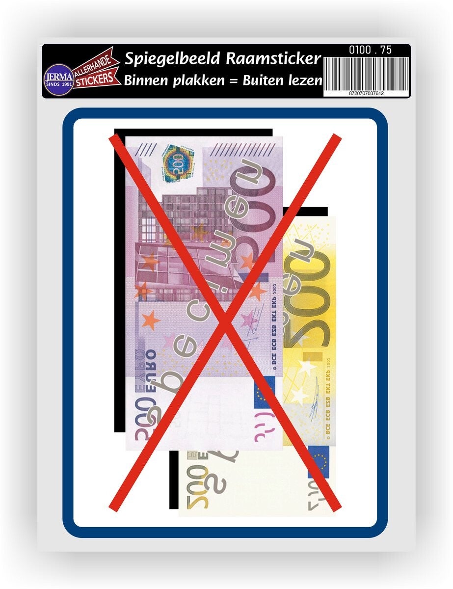 Raamsticker contant geld, betaalsticker winkel, spiegelbeeldsticker glas, waarschuwingssticker 500 euro, vinylsticker Jerma.