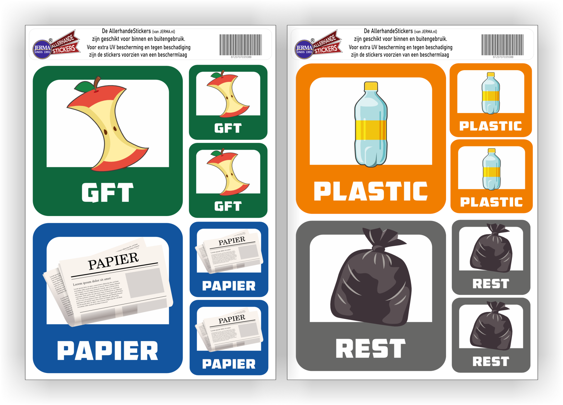 Maak afval scheiden makkelijker dan ooit! Met deze complete set van 12 hoogwaardige recyclingstickers voorkom je verwarring bij de kliko of de afvalbak in de keuken. De stickers zijn uitgevoerd in de officieel voorgeschreven kleuren en voorzien van duidelijke iconen voor Restafval, GFT, Papier en Plastic (PMD).